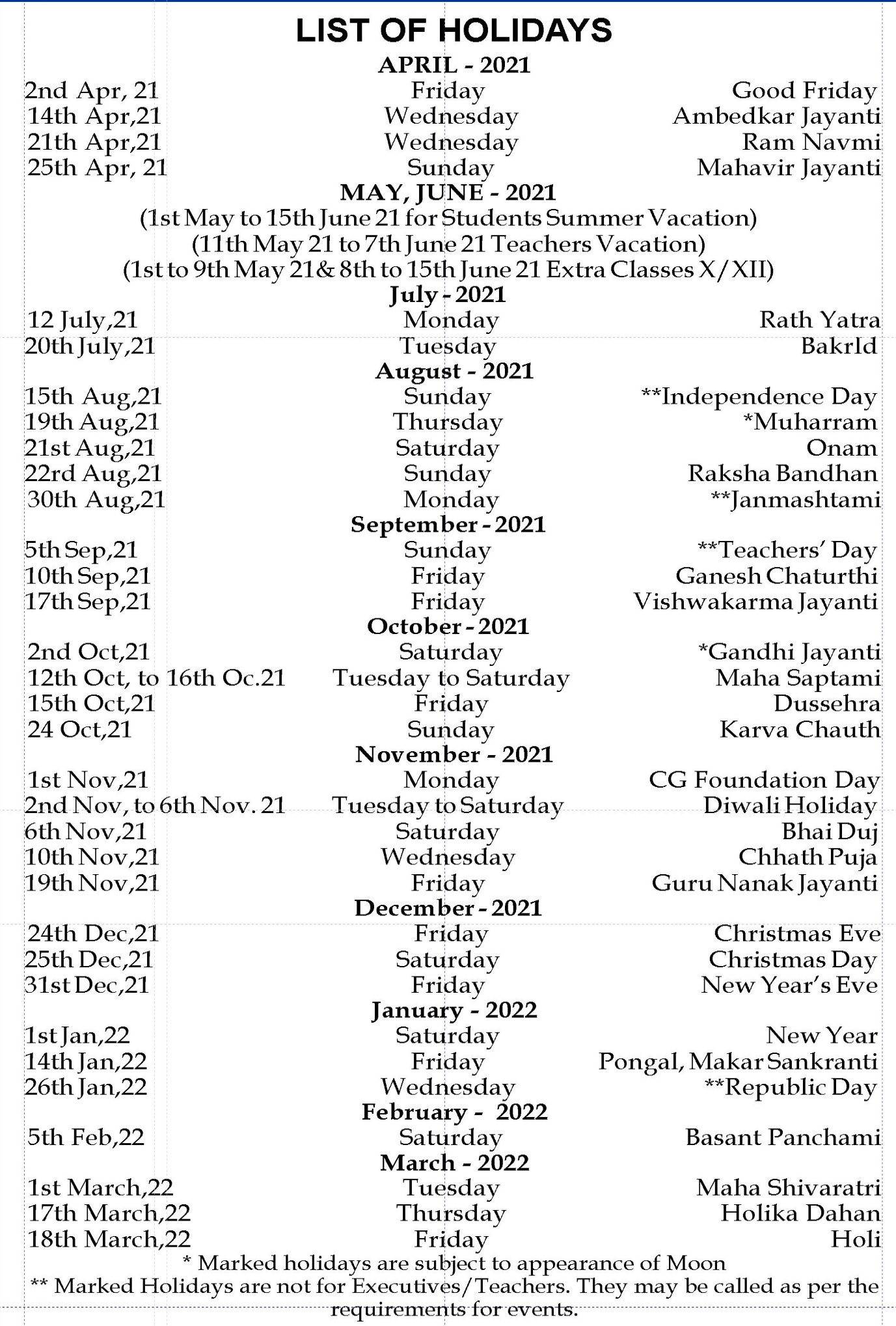 LIST OF HOLIDAYS
