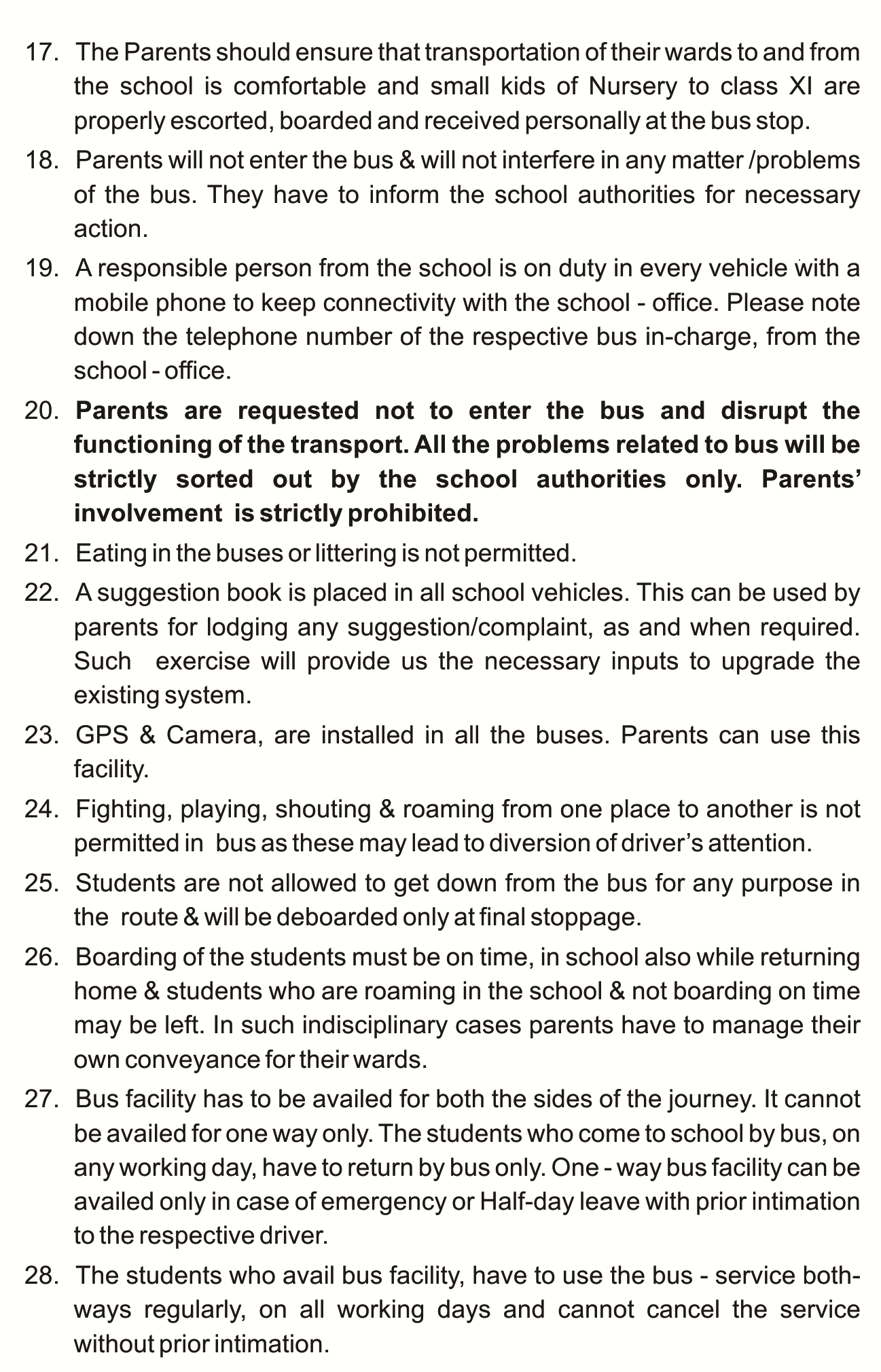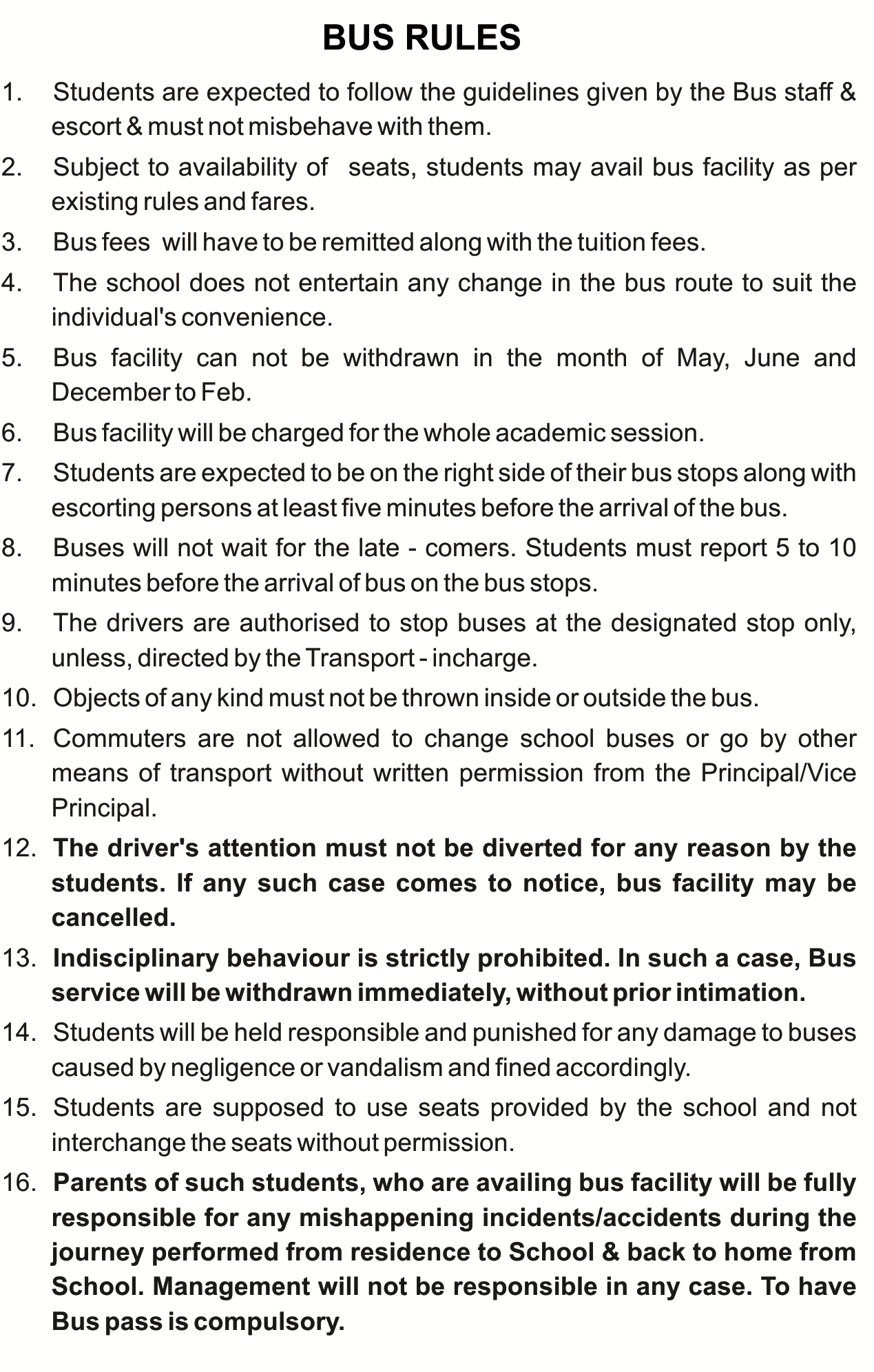 TRANSPORT(BUS AND VAN SERVICES) Students can avail the school transport subject to the available of seats. The routes of the school buses are drawn up and the parents should consult the school transport in-charge/ Principal for necessary details.